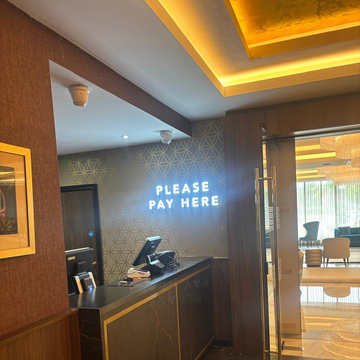 The all-important “Please pay here” sign needed to be eye catching and visible from throughout the banquet hall. In line with the character of the space, we went big – creating a 2200-lumens sign with face-lit letters that really stands out. But we also provided a dimmer switch to give the client ultimate control over how bright they want it at different times of the day.